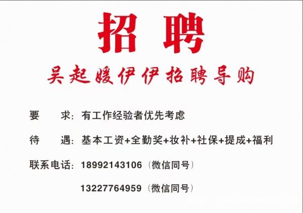 招聘 吴起媛伊伊店招聘导购 基本工资+全勤奖+妆补+提成 地址:金茂大厦(舍念隔壁) 联系我时,请说是在微城看到的,谢谢!