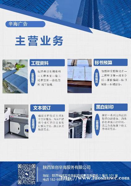 辛海广告, 主营业务有标书制作—工程预算—工程资料—打印复印等其他相关业务。 如果您有需要,随时可联系18298833030 联系我时,请说是在微城看到的,谢谢!